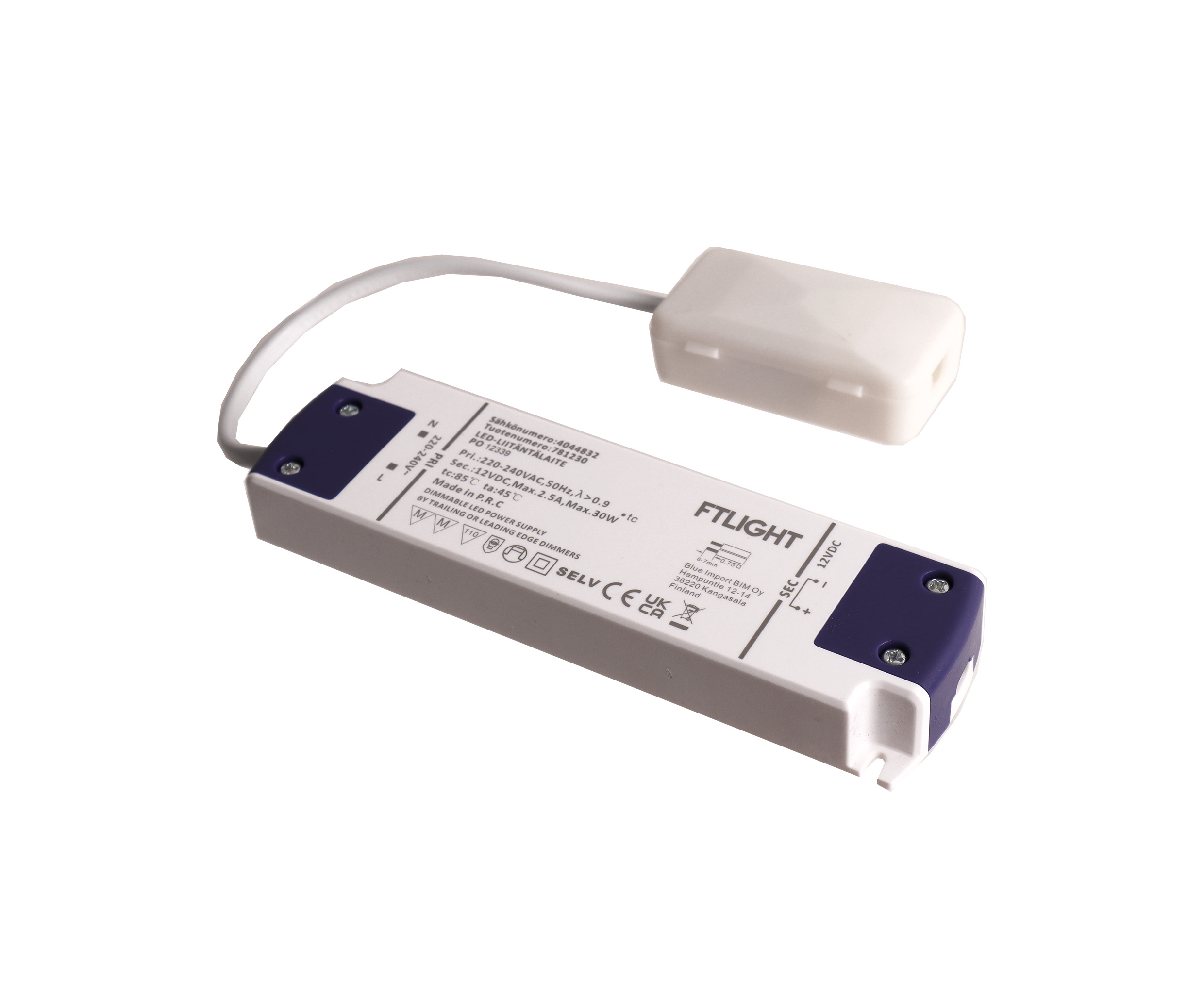 FTLIGHT vakiojännite Triac-liitäntälaite 12V 30W esimerkiksi LED-nauhoille. Kytkentöjen helpottamiseksi 230V puolella on kytkentärasia jossa on 3×1,5mm2 jousiliitin. 5v. takuu.